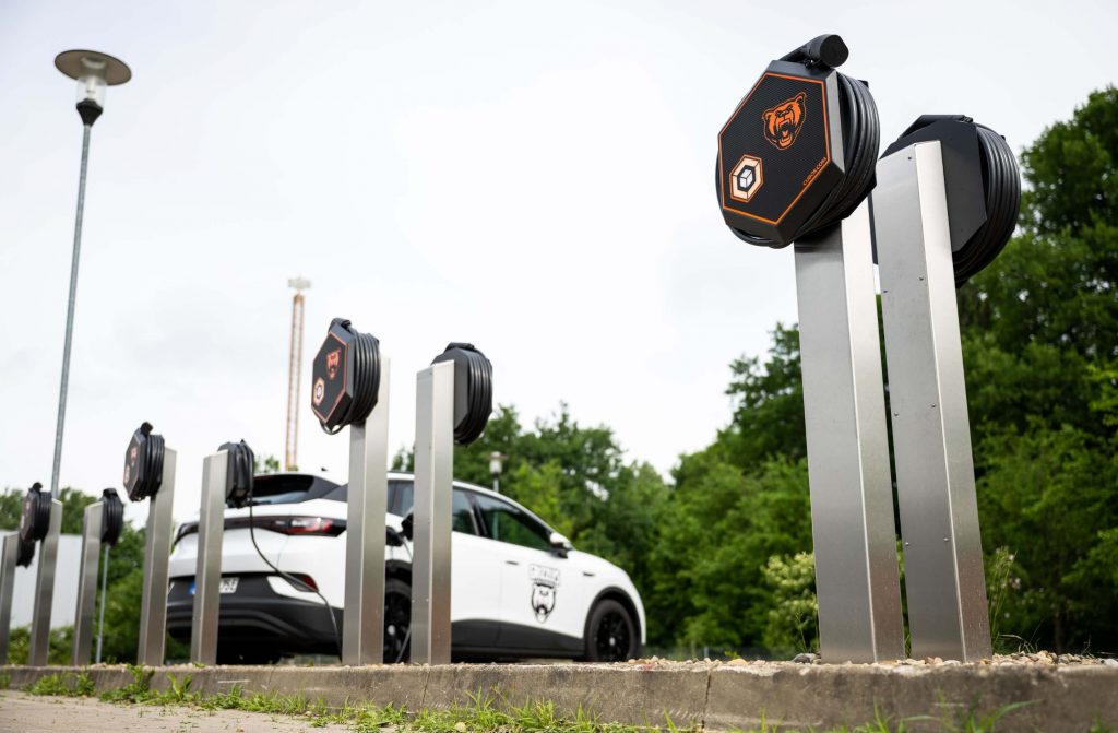 Gemeinsam mit dem Partner CUBOS haben die Grizzlys Wolfsburg bereits 2022 einen umfassenden Ladepark für Elektrofahrzeuge errichtet. Seit April 2022 stehen auf dem Parkplatz für Mannschaft, Betreuer und VIP hinter der Eis Arena insgesamt 20 Ladesäulen zur Verfügung. Diese ermöglichen den Spielern und Mitarbeitenden den komfortablen Zugang zu emissionsfreier Elektromobilität. Seit der Inbetriebnahme konnten durch die Nutzung des Ladeparks bereits rund 19,4 Tonnen CO₂-Äquivalente (bis zum 17.07.2025) eingespart werden. Das entspricht dem Kompensationseffekt von etwa 1.553 Bäumen, ein deutliches Zeichen für die Wirksamkeit dieser Maßnahme im Sinne des betrieblichen Klimaschutzes.